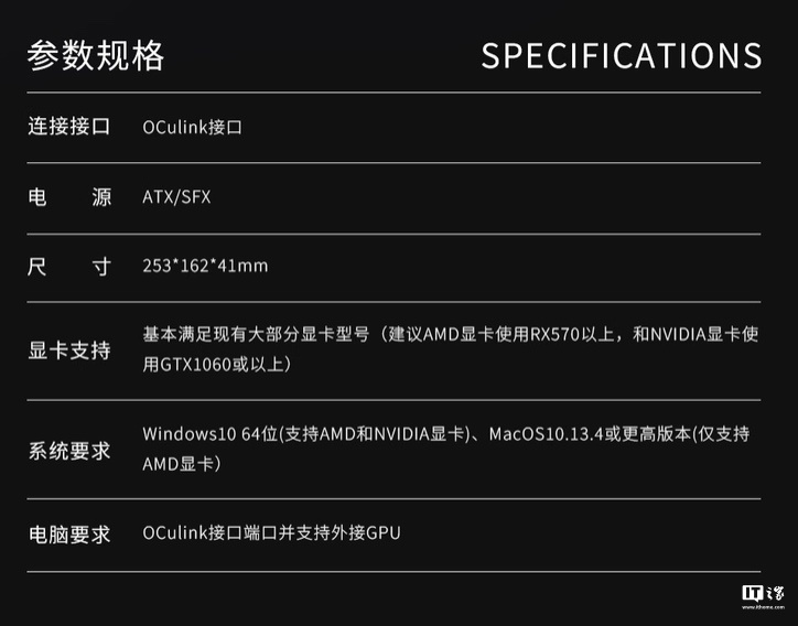 该拓展坞提供 PCIe X16 显卡插槽,荒芜提供 24Pin 供电;侧面配有 OCuLink 接口,取消了上一代的千兆 RJ45 接口和雷电 3 接口。